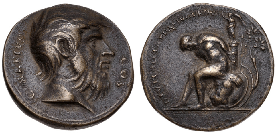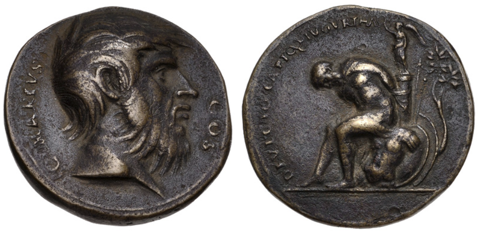 The earlier Belli medal was new to me and had it’s artist not been identified my first thought would have been to associate it with the tradition of Paduan Medals, associated with Giovanni dal Cavino and those working in a similar style. Essentially fantasy pieces of a sort. Marius is the rough and ready soldier and Jugurtha is much like any bound prisoner at the foot of a trophy (cf. Judaea Capta et al.) but the prisoner bound to a column with victory atop is not known on the Roman coin series to the best of my knowledge (I hate arguments from silence).