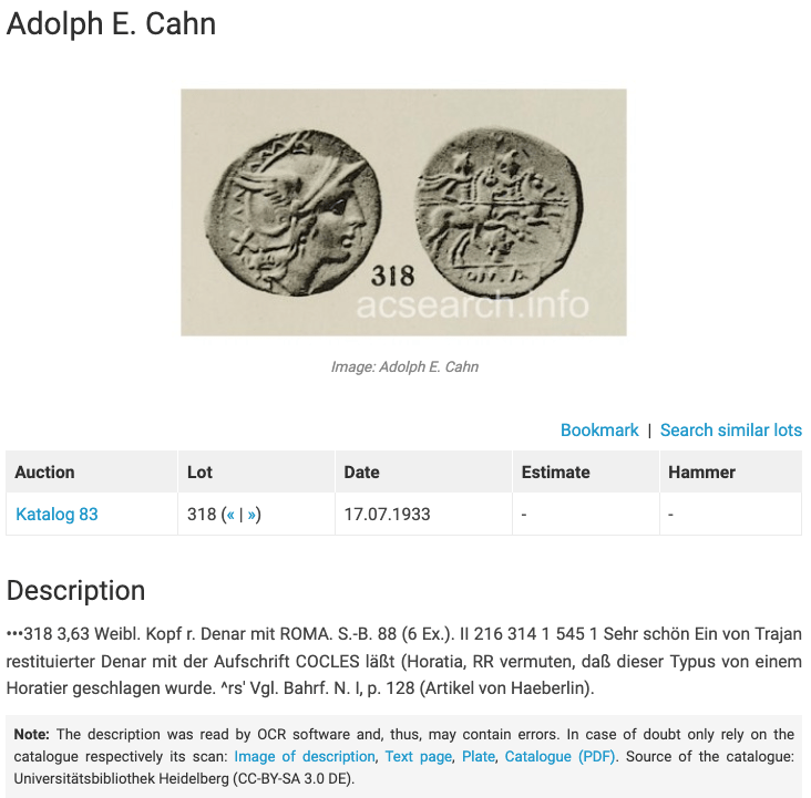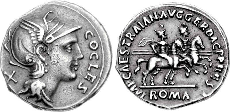 The vast majority of circulating COCLES coins, at least all those without the female head in the field, are modern forgeries; see the compilation in Komnick TE. 23. The Becker forgery (Hill, Becker No. 164) in particular often goes undetected; see, for example, Milan, Belloni 181 or SBV 30 (September 15, 1992), 201 (3,45).