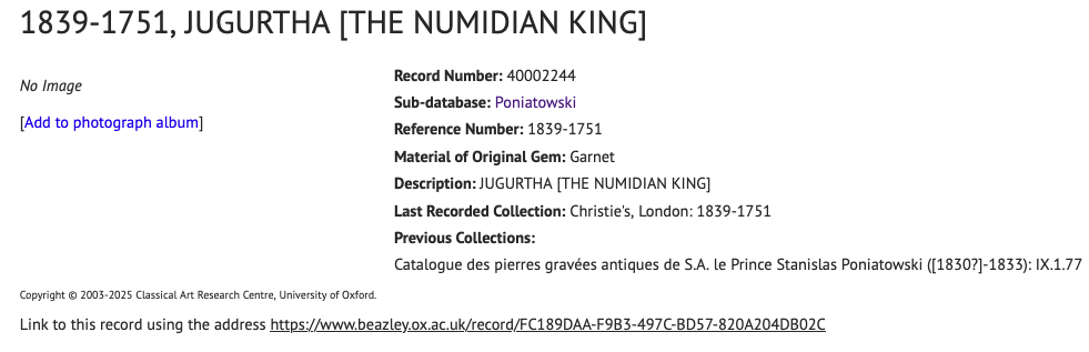 Apparently there was a similarly identified gem in the Poniatowski collection, a garnet not an amethyst, or so Beazley tells me without any image.