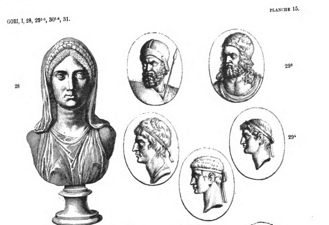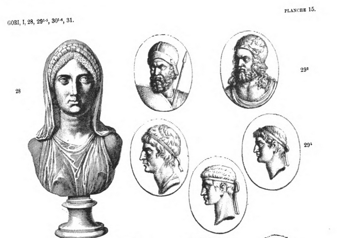 Italie – Florence : Musée archéologique – N° inv. 14952. Intaille en améthyste. Buste de guerrier de face, barbu, casqué, tenant une lance et un bouclier. Identifié comme Hannon, Jugurtha ou Massinissa (?). Ancienne collection Médicis.