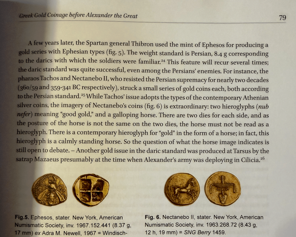 It was news to me that Tachos (Teos) struck before Nectanebo II and thus that heiroglyphic coin in fact suggests a rejection of designs that emulated outside traditions even as the striking of coinage was itself an innovation for of Pharonic Egypt. What I’ve not managed to find yet is any illustration of Tachos’ coinage.