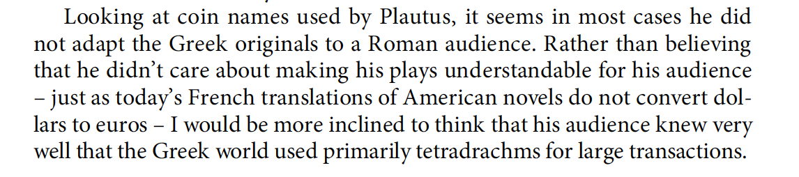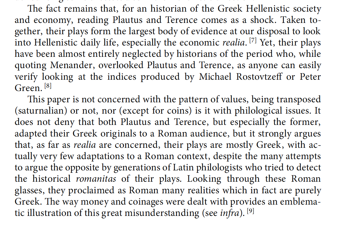 Thus in what follows are my reading notes on why I think De Callataÿ goes too far to try to create a strict dichotomy between the realities of Rome and the realities of the Hellenistic World in the time of Plautus and Terence, post 1st Punic War down to the decade just following the 2nd Macedonian War. Read Rome as economically and monetarily as fully Hellenistic in this period. This means that plays adapted from themes popular in Greek drama in an earlier Hellenistic period are equally relevant to a Roman audience.