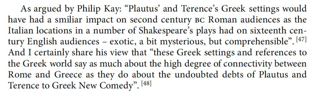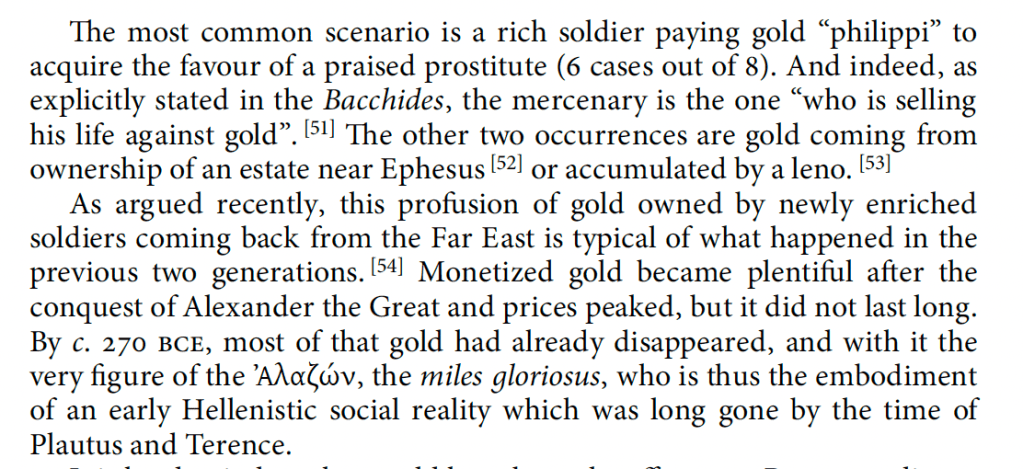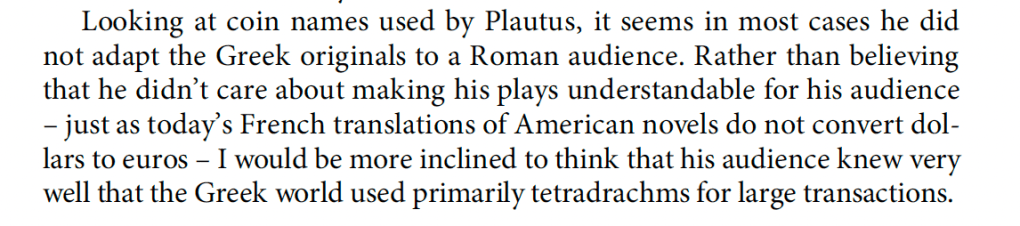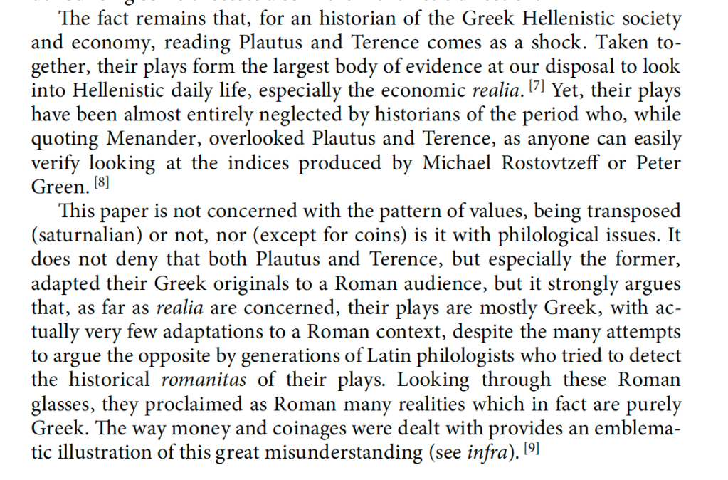 It is a rare thing for me to disagree with a scholar I admire so much. It worried me enough that I left the library yesterday in a bit of funk, committed to sleeping on the topic. And thus am revising my original notes before posting. The truth is De Callataÿ is an insightful reader of Roman comedy with a keen eye to the economic implications of the texts. I don’t disagree with the vast majority of his 2015 article and really after page 31 it brilliantly captures the full breadth of economic and monetary history we can extract from the corpus of these Latin plays. So why my funk. I don’t even disagree with the premise that the plays are good evidence for the Hellenistic period, it is only that I believe that Rome is very much at the time of the writing of the plays a Hellenistic state and that the plays reflect a shared reality. I am also very persuade by Amy Richlin’s work on the creation and context of these plays and performance, a world of the enslaved, and thus of individuals involuntarily culturally relocated from one setting to another.
