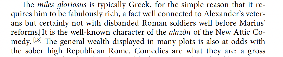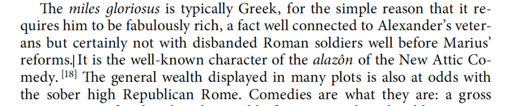 Did these amounts even one that was considered far too low by the ordinary soldier represent a life changing amount of money? I think yes. Stipendium is typically presumed to be a denarius ever three days for infantry, with grain and other matters deducted. 100 denarii is perhaps approximately what a soldier could earn in a whole year of fighting. 300 denarii (the Epirus donative and the donative after the triumph combined) is likely a generous 3 years livelihood. Any ordinary person handed 3 times they’re typical annual earning power is going to feel and perhaps act as having a very significant windfall. Yet these soldiers felt it was disappointing. Just over 3 decades earlier Scipio had given out only 40 asses per soldier but expectations were shifting fast, esp. in light of the influx of eastern wealth. Besides reports of cash pay outs Roman soldiers had long been rewarded in kind, especially with land or the use of land. If the speculation that Miles Gloriosus might have been first staged in 206 BCE is correct, the stock character of the braggart soldier enriched by War could certainly have been relatable to Roman audiences and may have even engendered hopes of a return to economic prosperity after the end of the Hannibalic War.