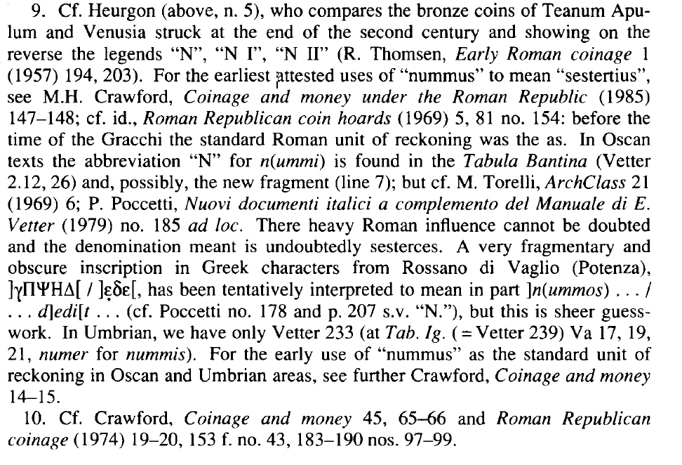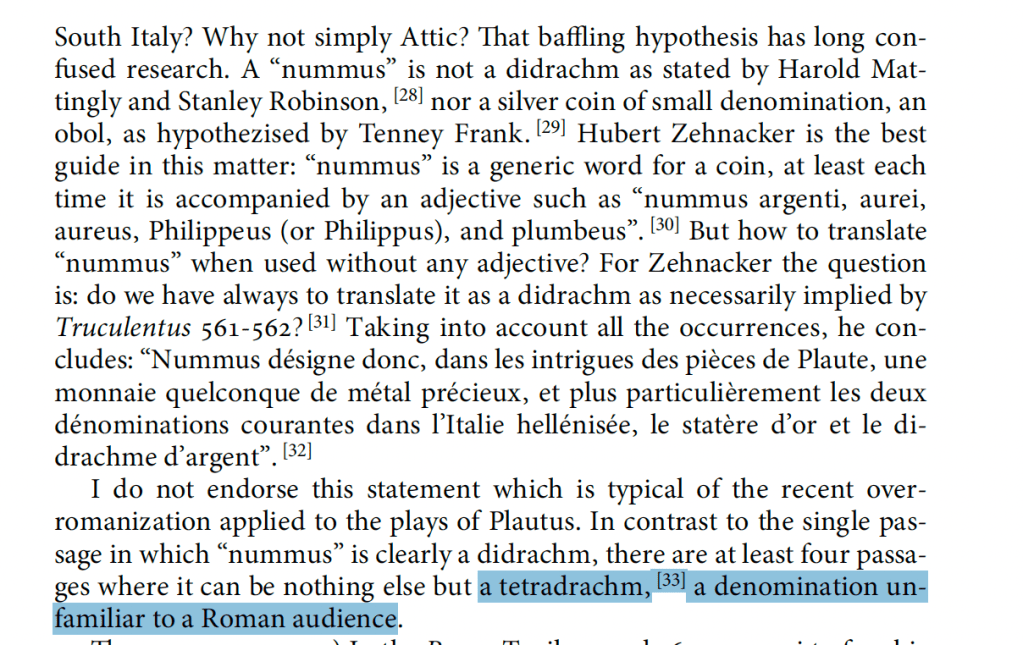 De Callataÿ is correct that nummus could mean tetradrachm in many places in Plautus, but I’m not convinced this is what it must mean. We’re out of luck for earlier literary Latin giving us clues, but we can get some help from epigraphy. I lean towards it meaning simply COIN and to an italic audience it would mean whatever happens to be local unit of account.