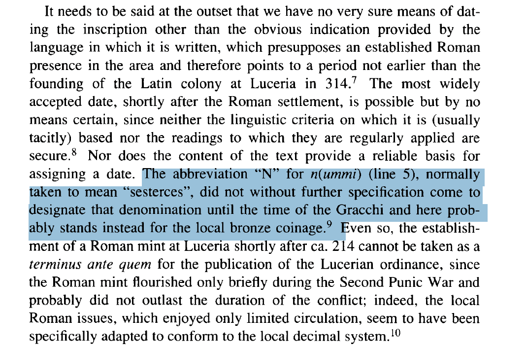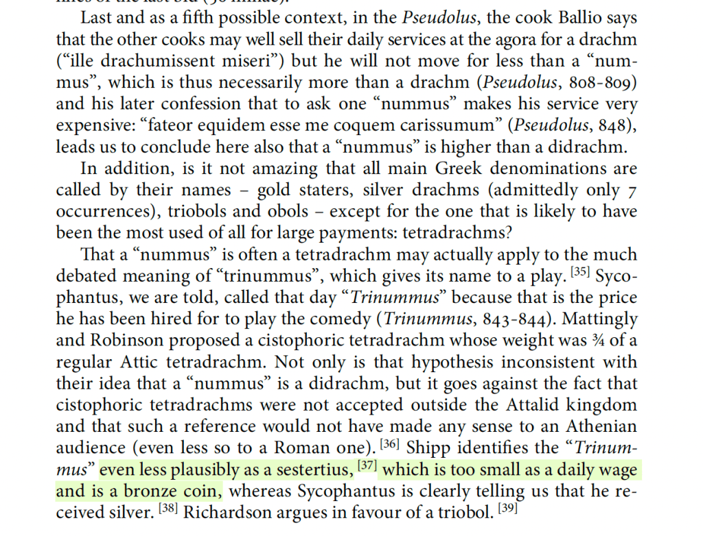 Of course the trinummus is not a sestertius but De Callataÿ has undervalued and misdescribed it. In the time of Plautus and Terence the sestertius was 2.5 asses, 1/4 a denarius, and very much a silver coin. Eventually it is retariffed at 4 asses but remains silver until the imperial period. It would be a very low single-day’s wage but not wholly inconceivable: remember a soldiers stipendium was 10 asses every 3 days. My guess is that most Romans in the audience would have assumed that a nummus was an AS that was the unit of account.