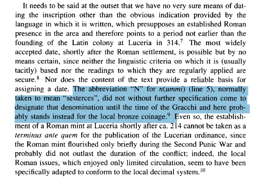 Our earliest testimony for the term nummus that I know of is from an inscription found at Luceria, and lately the preferred date is between 314-250 BCE.