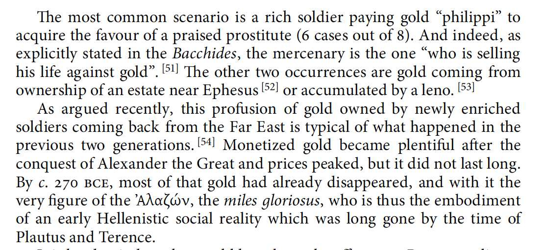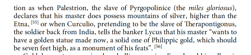 The gold of the plays is reflecting a monetized use of gold very in line with the historical realities he describes. But to continue pushing back a little. In a society where gold has never really been used as money and typically money has been heavy bronze, it is significant that these plays are being staged at least for Plautus’ early productions when the Roman state has decided it must strike gold and we get all of a sudden the oath scene gold and then the mars eagle. It may even give us context for the failed experiment of the Flamininus stater which is very much based on the very goldphilips so common in these comedies. (RR gold issues before 189 BCE). The Roman gold will fall out of circulation just like the Hellenistic did, but to the most contemporary audiences it would be a well-known artifact of recent wars. Gold is unusual and this is what makes it a good plot point for motivating characters.