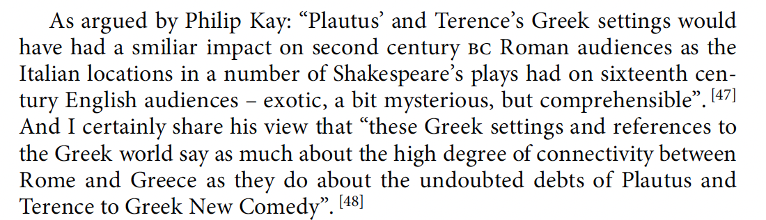 I also wonder if I am allowed a middle ground, a via media, by which I assert that the Romans are part of the Hellenistic world and that in particular the enslaved and/or formerly enslaved who developed and performed these theatrical productions were products of the Hellenistic Mediterranean with its incredible (and disturbing) mass movements of humans through enslavement, fueled by the ambitions of competing empires.