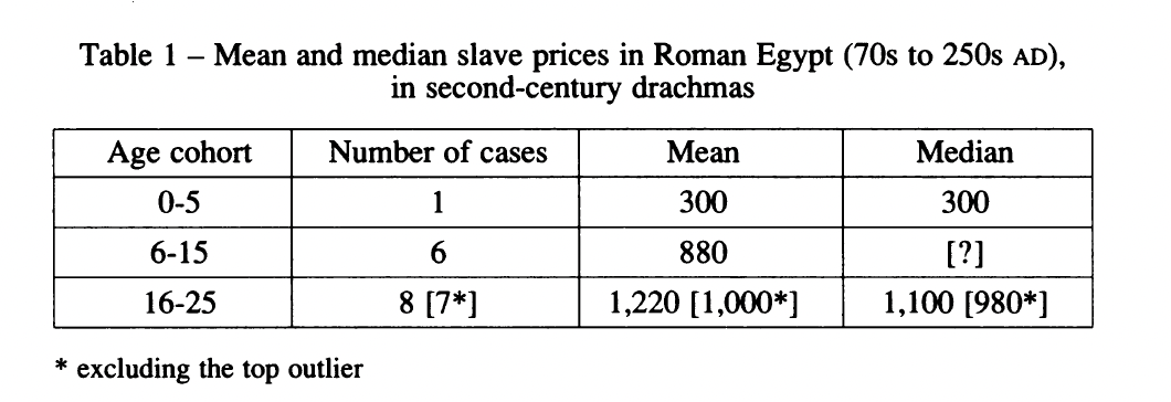 To convince his reader that nummus in Plautus most commonly means specifically a tetradrachm, De Callataÿ puts a great deal of weight on what is an “appropriate” price for a slave. I’m not convinced by this logic as prices of slaves vary greatly and I could if chose find parallels for numbers in asses paid for slaves. Compare above the 500 denarii per enslaved Roman attested c. 196 BCE. Or the following testimony from actual sales in Egypt: