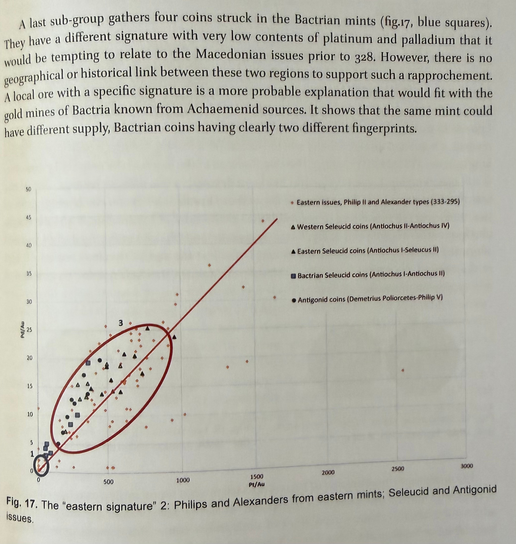 Unsurprisingly most of the Seleucid gold shows the same type of mixing, the exception being the Bactrian mint which not only strikes recycled metal but also seems to access local mines for fresh ore and to coin that as well.