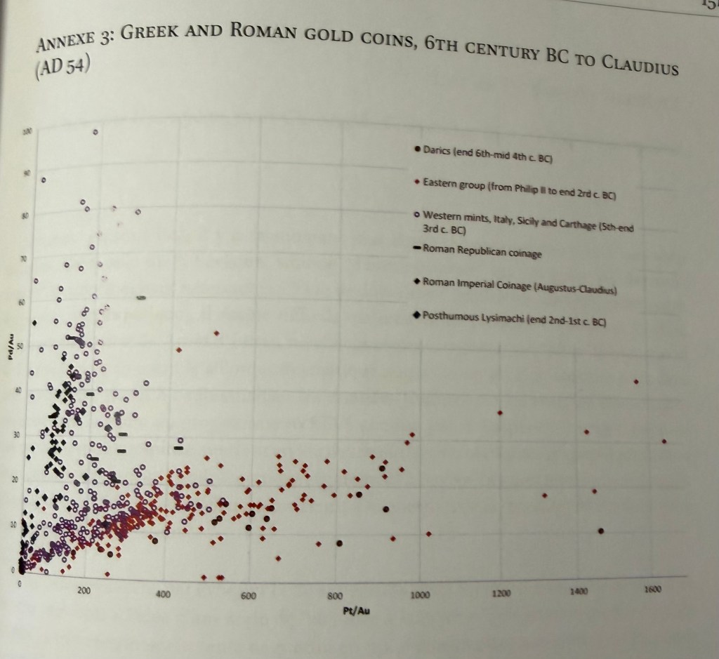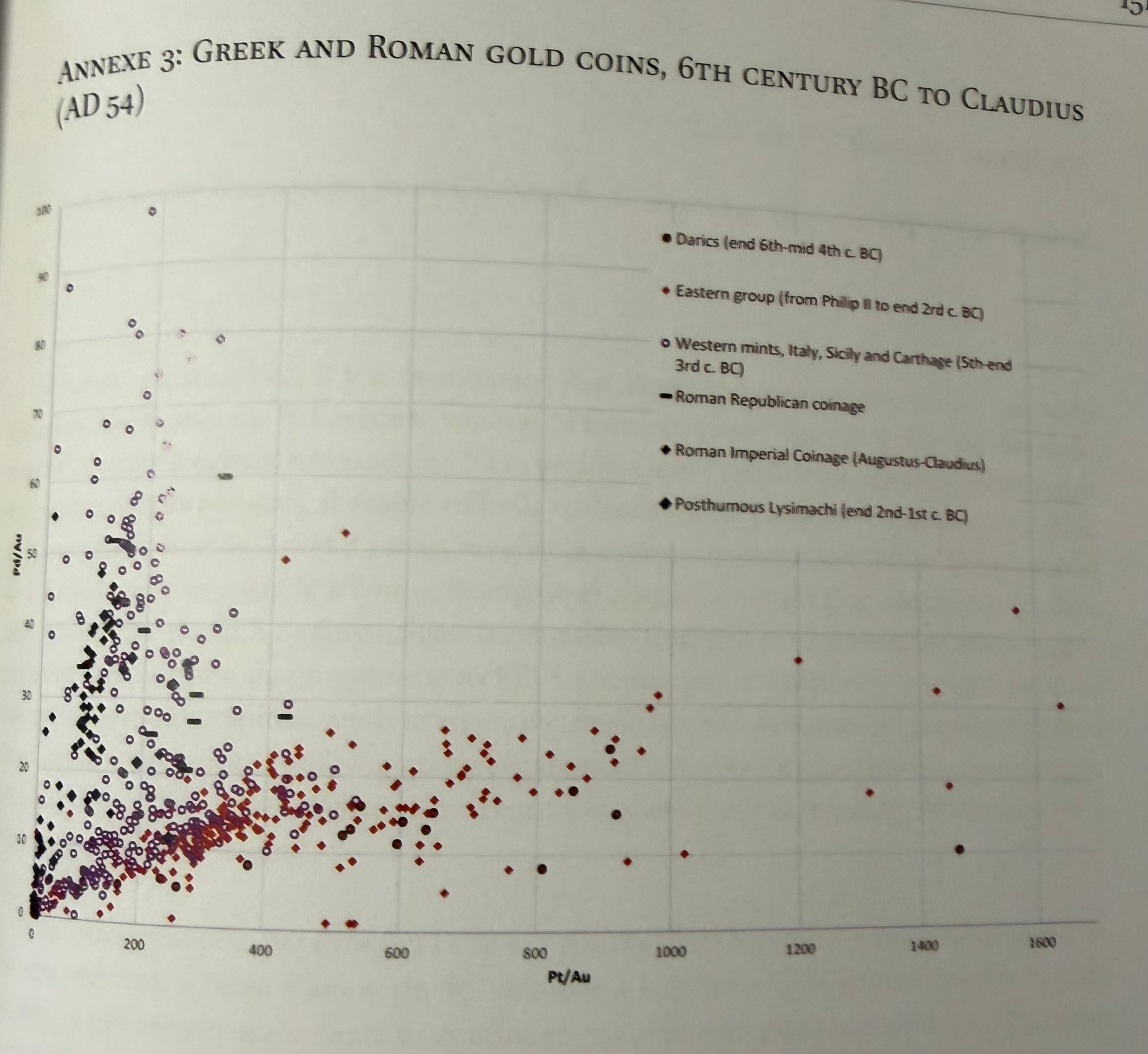 I’m on to Duyrat et al. in AVREVS. It’s nice when our data matches our literary testimony. Here we have some further conversation use of die studies for quantification similar to the previous chapter but they quickly move on to metallurgical analyses. These seem to confirm that Philip’s initial striking of gold is very low in Palladium and Platinum consistent with recently mined ore, such as Diodorus point out. The analyses also show far higher and variable levels of Palladium and Platinum for both Darics and Alexanders struck in Asia Minor. The authors quote Herodotus and Strabo to suggest that the higher variable levels of these trace elements is reflective of repeated melting and mixing of the metals.