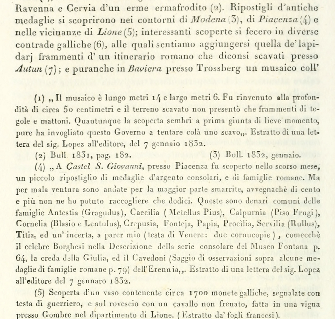 There is a fascinating narrative of discoveries between January and June 1831 including much of what I think is the house of the faun and also the discovery of a woman, her child, and some personal belongings. The end of this report makes allusion to many small finds without specifying where in the excavation area they were found but most tantalizing to me is the several hundred silver coins mostly of the republican period. This is squashed in with reports of gems and jewelry. (p.9)