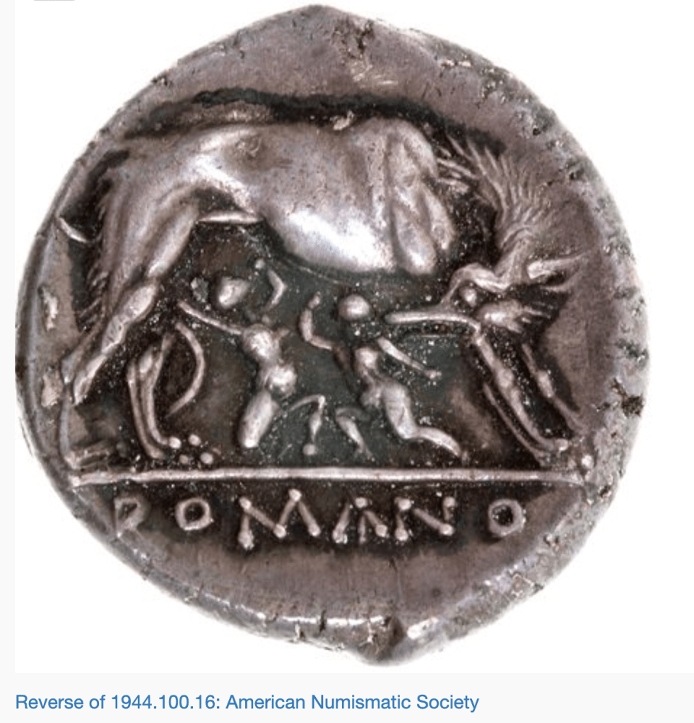 While Coarelli might be wrong about dating, he’s not wrong that there could (but need not) be overlap between the Lares as founders and Romulus and Remus as founders. We cannot know what was in the minds of the Ogulnii or their contemporary in 296 BCE. We cannot even know beyond a shadow of doubt if the attribution of the statue, its dates, the conditions and placement of its erection are accurate. Livy was wrong about the introduction of silver and many other things he could be wrong about this as well. If we want 296 BCE to be a firm date we need to trust Livy’s access to accurate records. Do we? Why? If it is inaccurate do we think Livy is making stuff up completely? OR, do we blame an unknown intermediary for falsification.