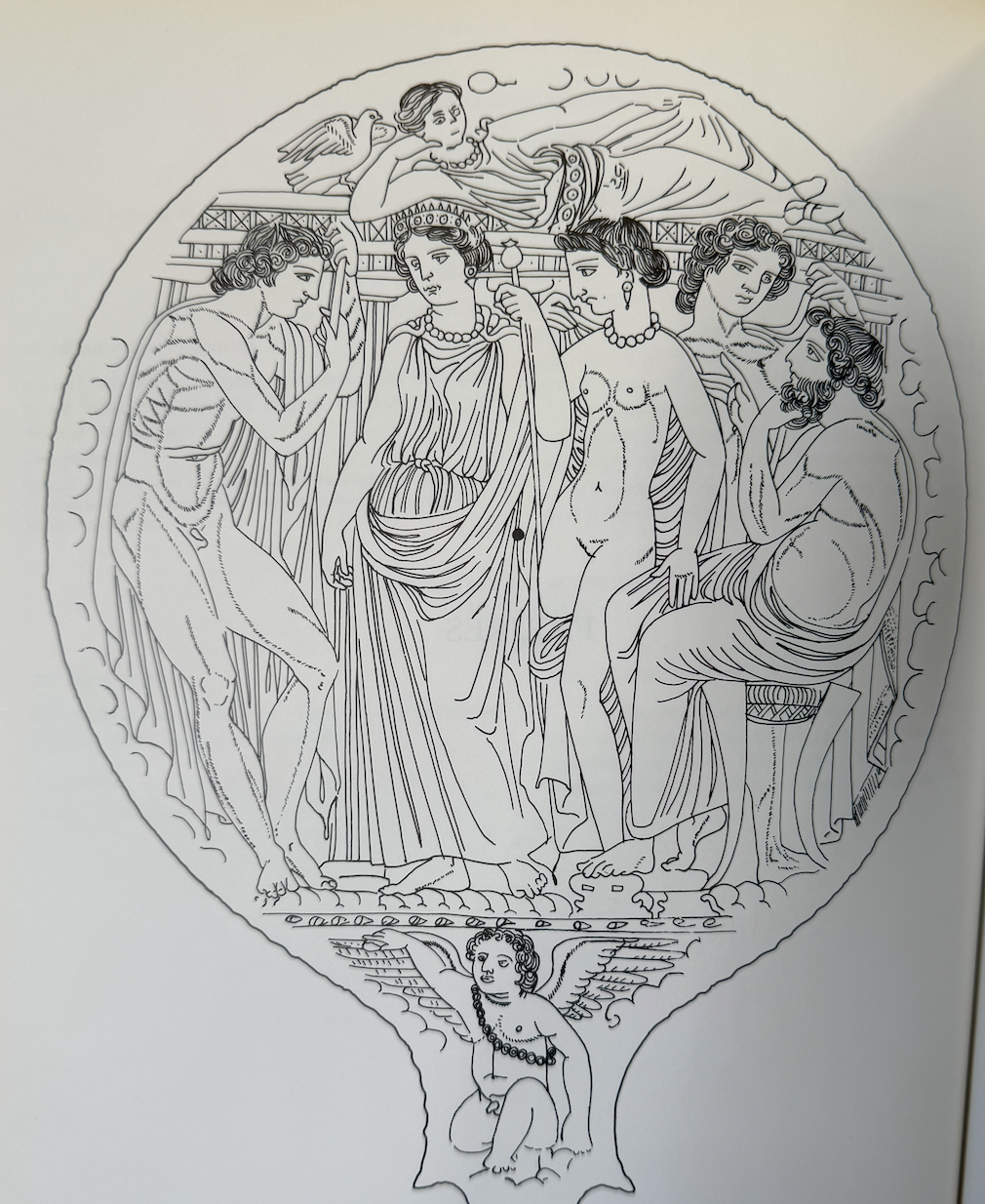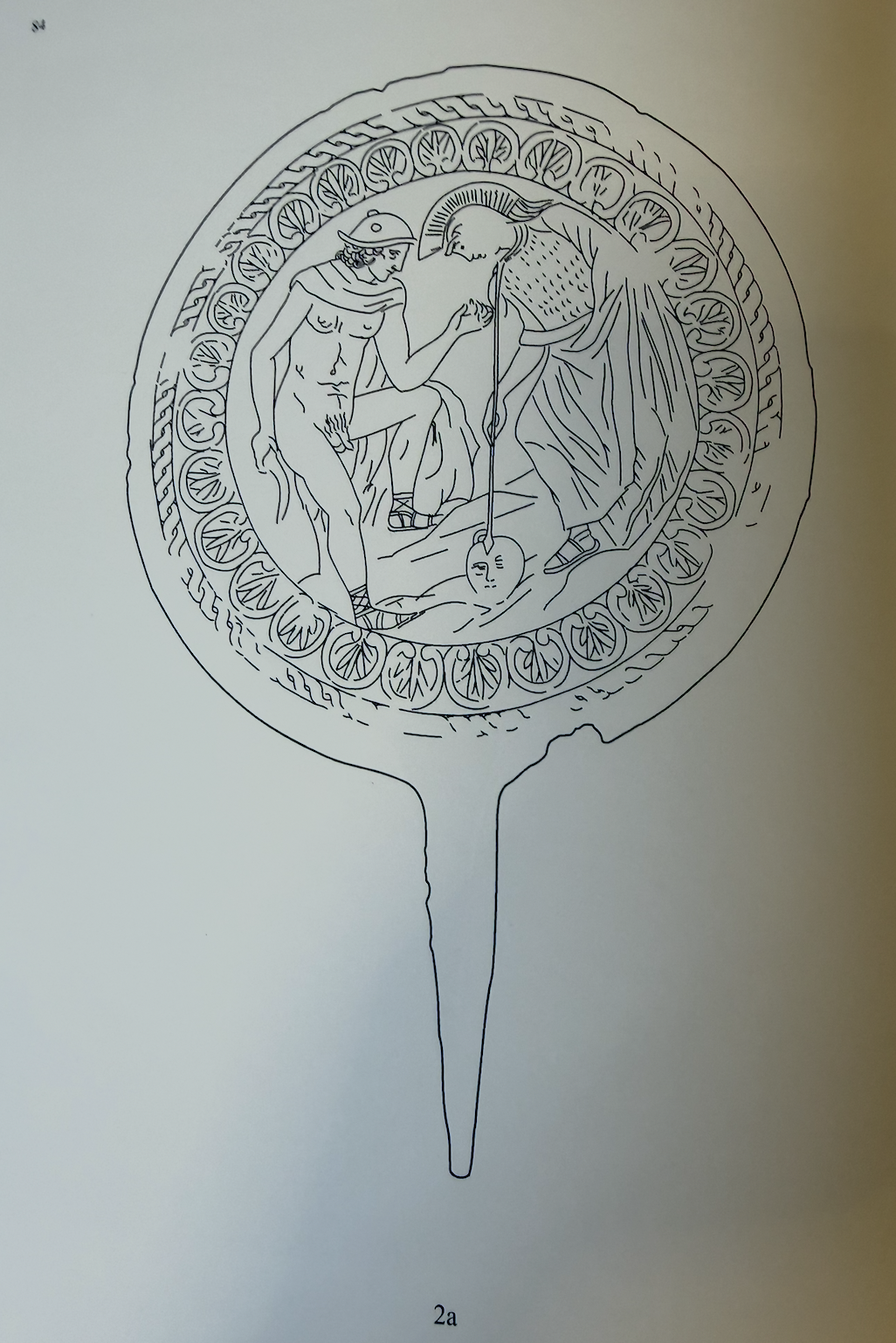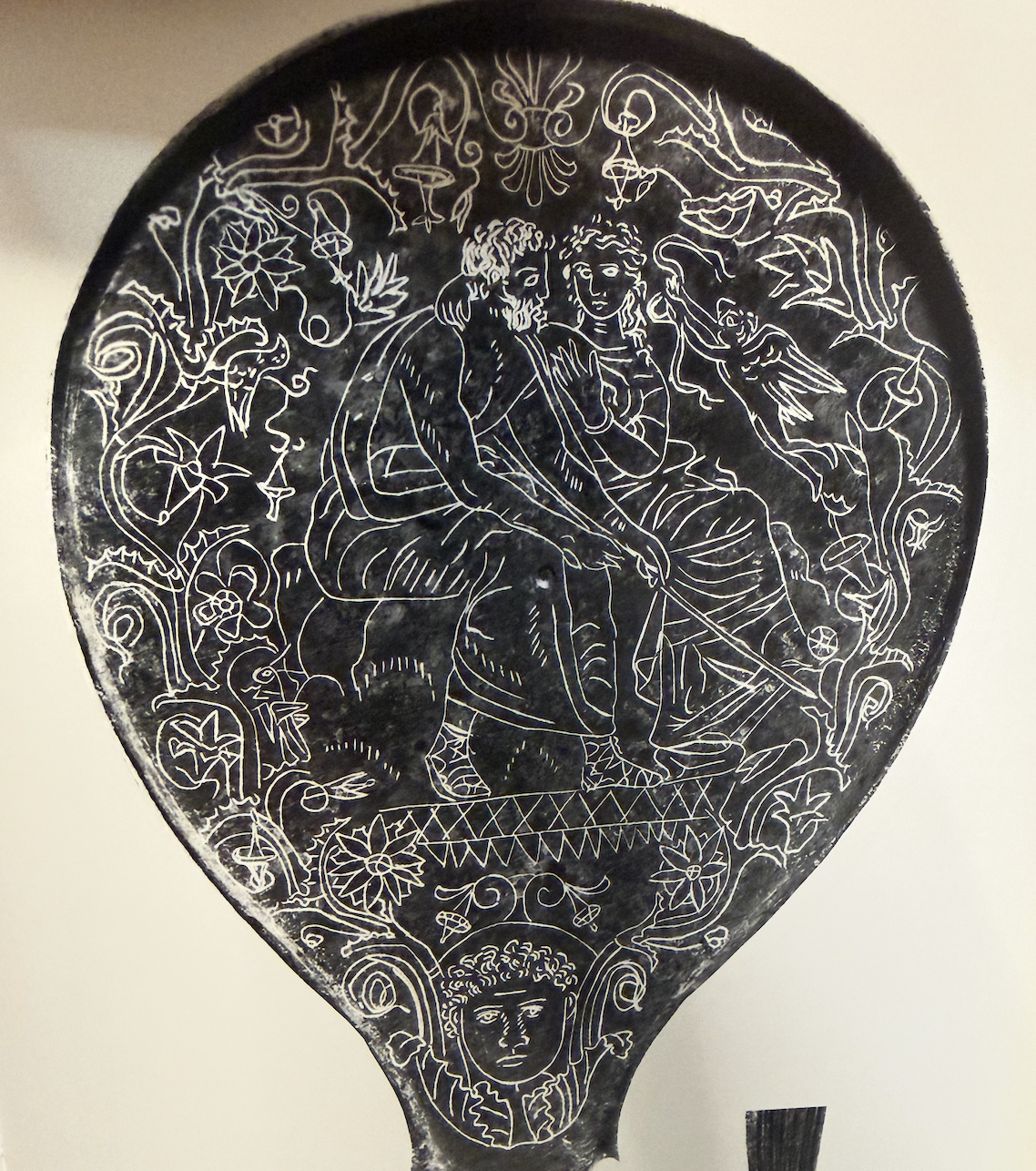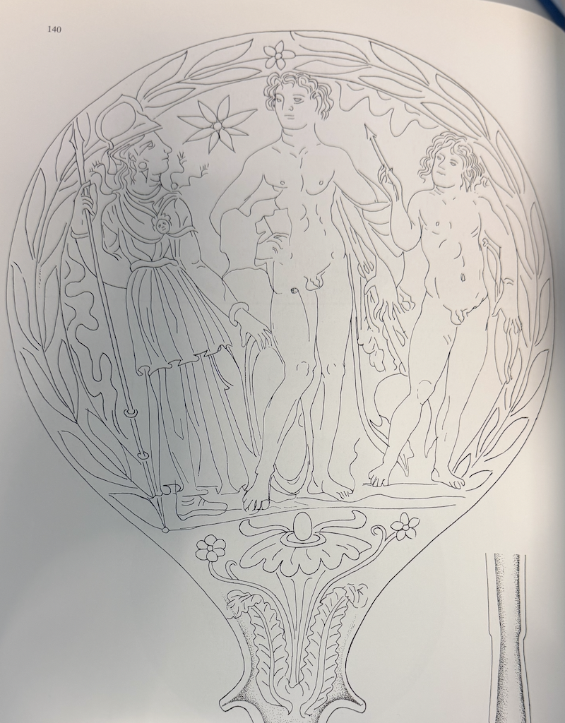 By far and away the most common composition is two figures with Phrygian caps and boot (often in knee length costume belted high on the chest) looking at each other typically with a star or dots between. After this most figural mirrors had either a two figure, three figure, or four figure compositional layout. Most figures stand but those closest to the outside of the design tend to curve/bend towards the more central space/figure(s). Reclining figures are rare. When four figures are present there is often a temple visible above their heads. Nudity is the most typical costume and the vast majority of figures are depicted as youthful. Facial hair is reserved for old men (kings?), a few wild men and paternal gods like Jupiter. Babies and Elders are rarely depicted. Animals rarely take up much of the compositional space excepting sometimes horses and the occasional hunting dog. When women are heavily draped their faces tend to be covered. The vast majority of subjects are drawn from what we might call Greek myth rather than Italic. Certain subjects repeat (Pelius and Thetis, Many Aphrodite scenes, Birth of Athena, Helen’s Egg, Hercules and Mercury).