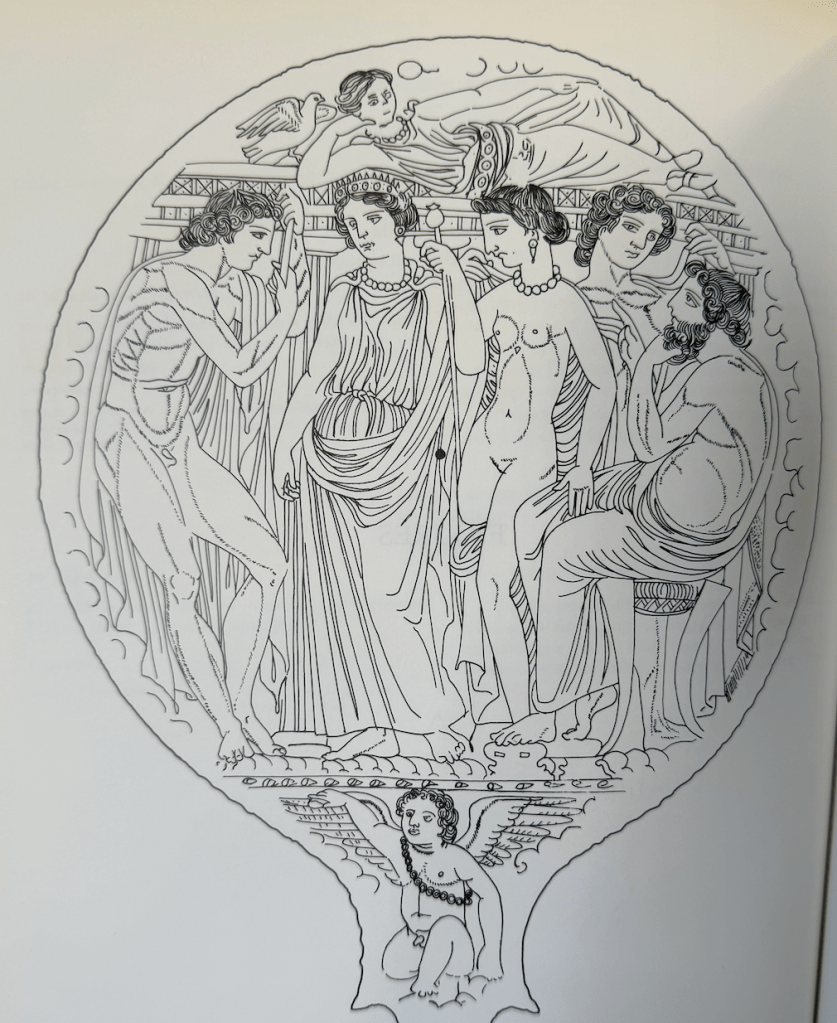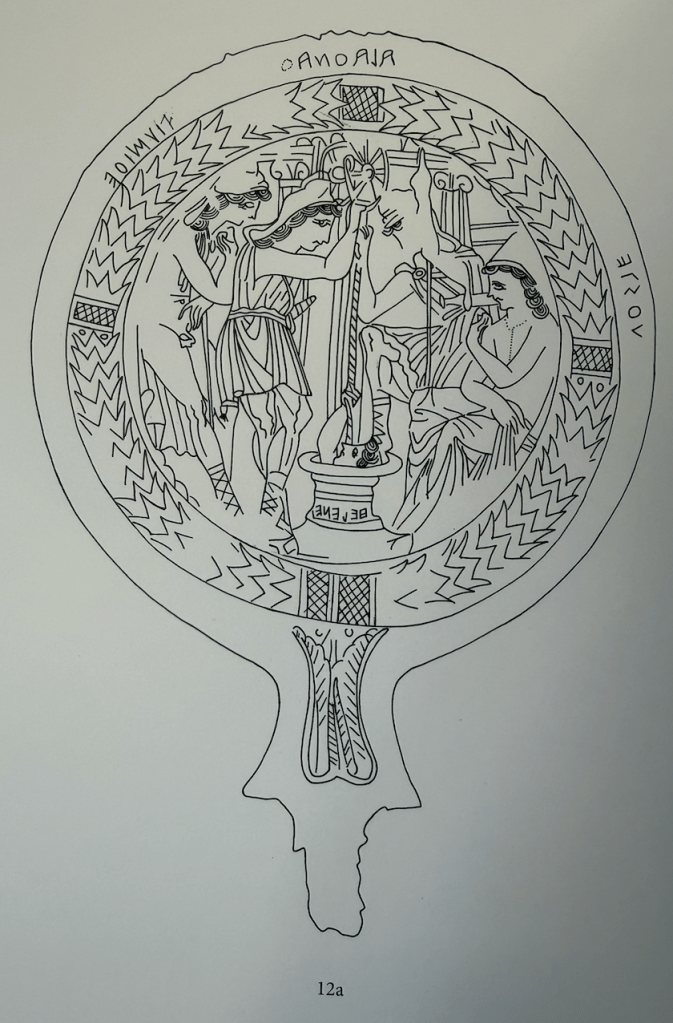 The Bolsena mirror feels familiar from my work on coins and intaglios, even lamps, but most mirrors do not feel this way. It is as if the vast majority of mirrors derive from a different stylistic approach to filling a circular compositional space. It also feels very Italic the same way much Etruscan tomb painting does but I’m thinking of especially the Tomba François or even some Bronze Cista (such as are associated with Praeneste, but also manufactured at Rome). Typically the Etruscan mirrors remind me more of the tondos of Kylixes if of anything besides their own well defined traditions.
