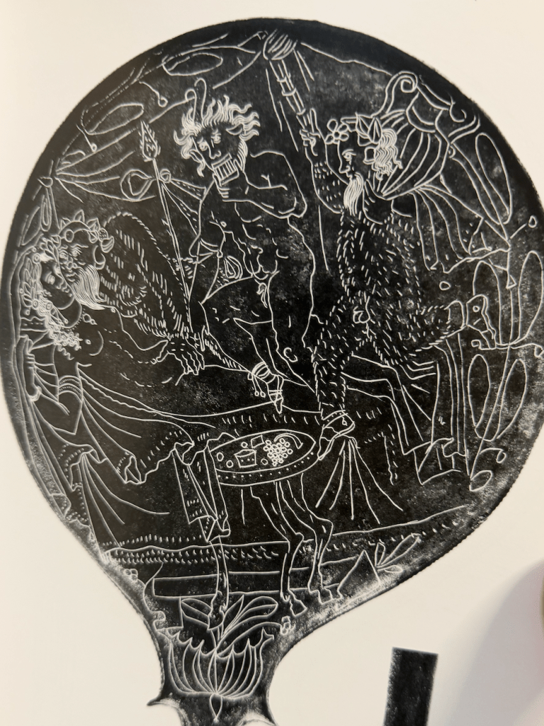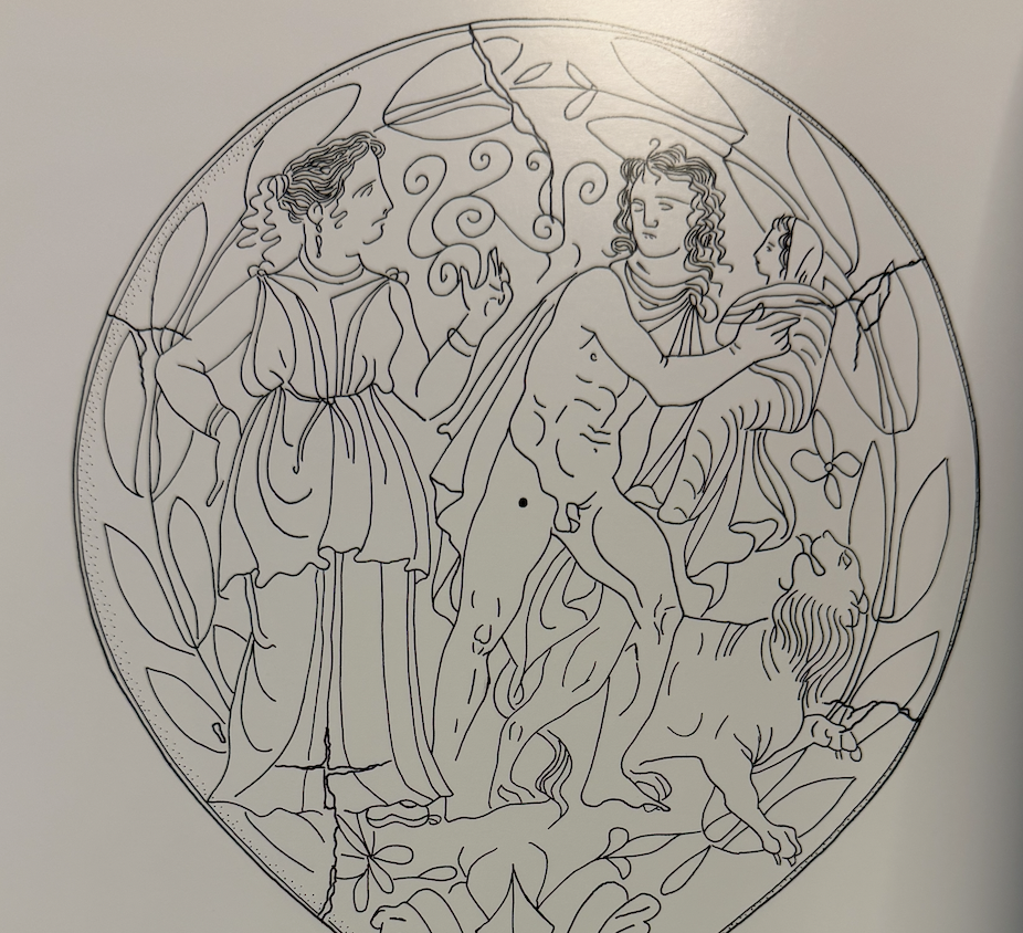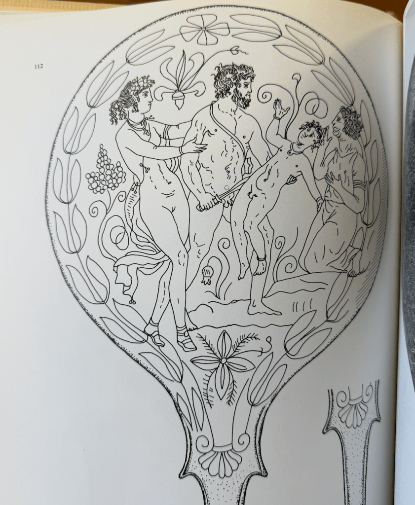All and all I’m left with the impression that the Bolsena mirror is bizarrely exceptional. I could find zero parallels for certain elements. That doesn’t mean they don’t exist, but it does mean they are unlikely to be common. I saw no bare trees. I saw no wolfs. I saw no lions that broke the fourth wall staring out at the viewer. I saw no women with fans or even fans as a compositional attribute in domestic ‘toilet’ scenes. I saw no figure in the same short tunic as the figure on the right hand of the composition.