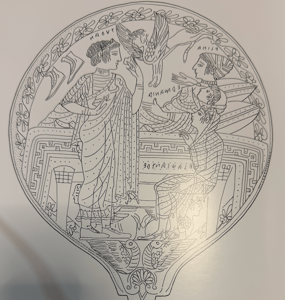 I don’t know why Helen is in a vase on the mirror to the right but given the motif of infants coming out of Vases I thought I’d include this one. Besides the mirror shown above there is a very similar one with three instead of two babies and then another cista with Mars coming out of a Vase. On the mirror to the right with Helen, the right hand figure is labeled Odysseus, the left hand Diomedes. The catalogue wanted ALAONAO to refer to owner of mirror, but shouldn’t it label the middle standing figure?