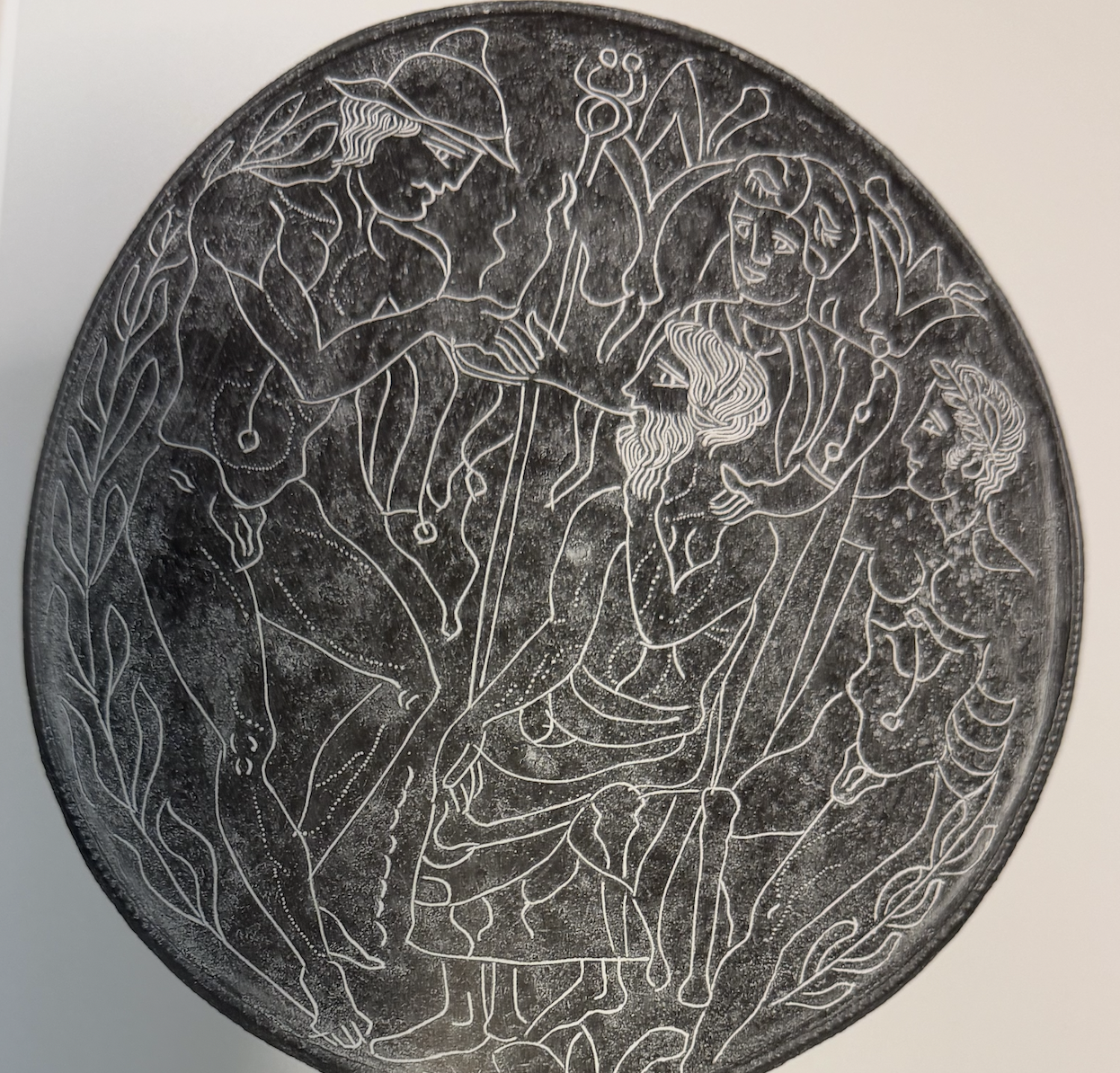 One of the only parts of the Bolsena wolf and twins mirror that feels deeply like other known mirrors is the ivy border growing out of a flower motif and the way the figures intrude into that border.
