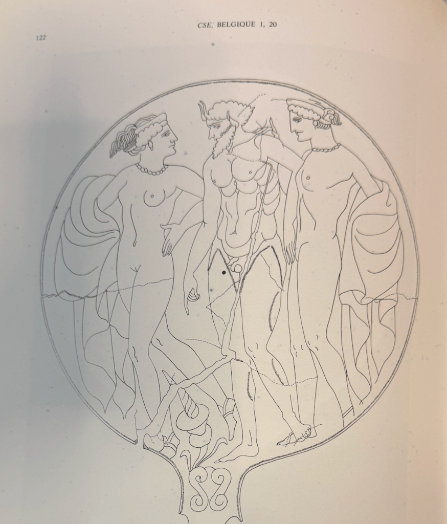 Whelp. I did it. Looked at every mirror in CSE and will do it again if I ever want to publish any of this official. I took snapshots as I went of things that felt potentially relevant, but as so often I’d approach the survey of the evidence differently if I knew then what I know now. On my next pass I want to quantify (1) how many of each border type including nature of the border, intrusion of design over border, any lines defining the borders (2) number of figures in composition (3) nudity vs types of costume (4) depiction of landscape and/or interior space (5) animals depicted (6) facial hair (7) veiling (8) presence or absence of negative space (9) figures peeking over or around inanimate objects (10) genre of subject matter. All of that would allow me to be more absolute in the following observations, but as I didn’t count specifics I’m going to just narrate my general impressions of what I saw.