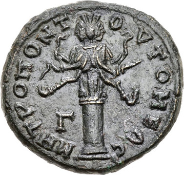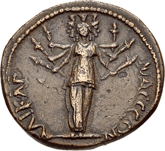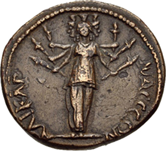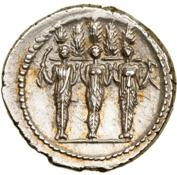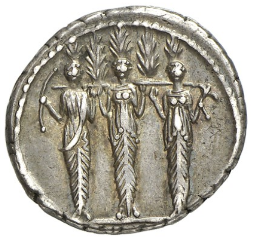 There are three figures facing the viewer. All three have what appear to be plant material coming from their heads but the representation is does not have any precise parallels with any other trees on the Roman coin series. On some interpretations they could be standing in front of trees. We might also consider if something other than plant material might be intended by the artist. Perhaps fire or flames? The central figure has a much larger bush emerging her head than the other two figures. This may mark her as more important or may be dictated by the circular composition. All three figures have tight cloth around their legs with a strong central seam or line. The geometric fabric folds create an arrow like patter pointing upwards and echo the downward lines of the decoration on top of the heads.