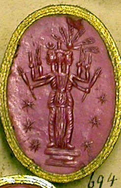 There are numismatic depictions of the three-faced goddess similar to the statues shown above and closely linked with iconography on gems.