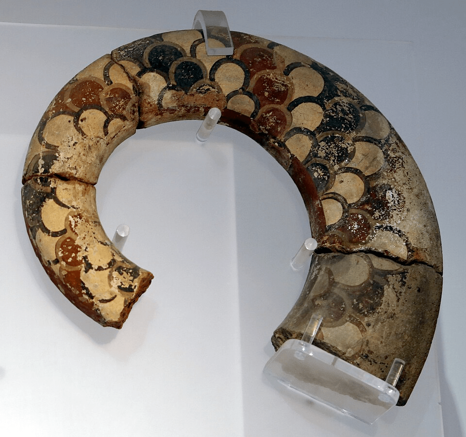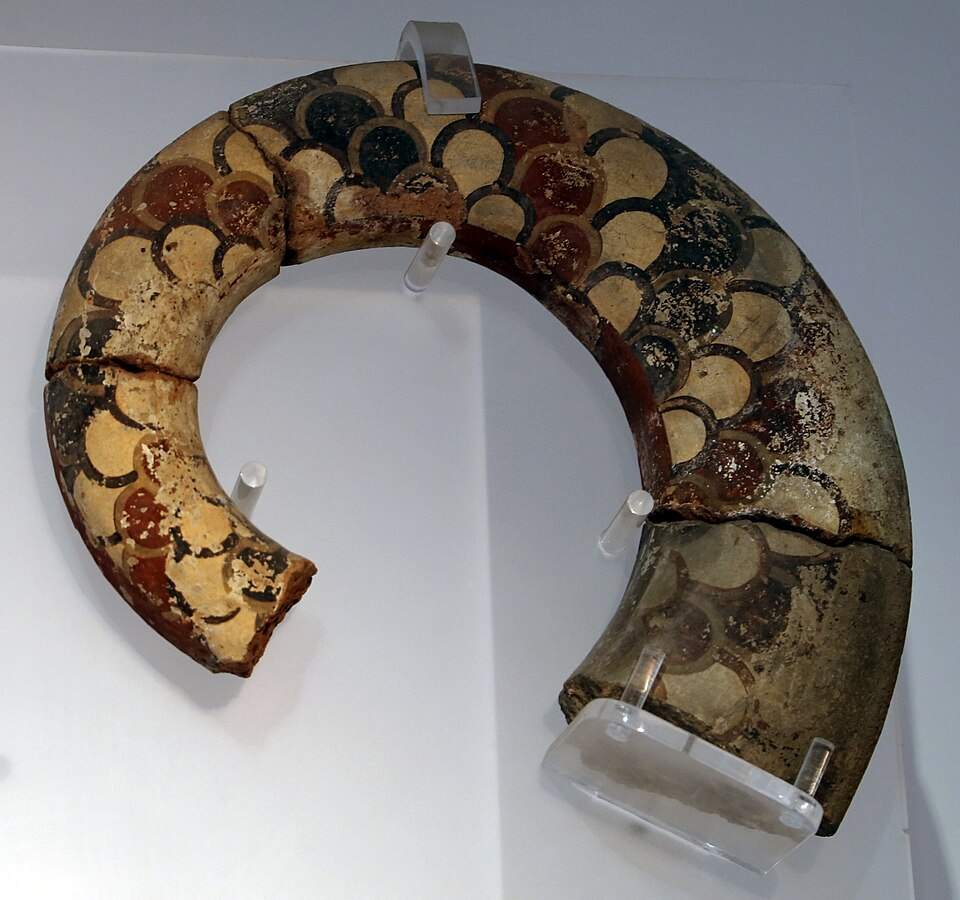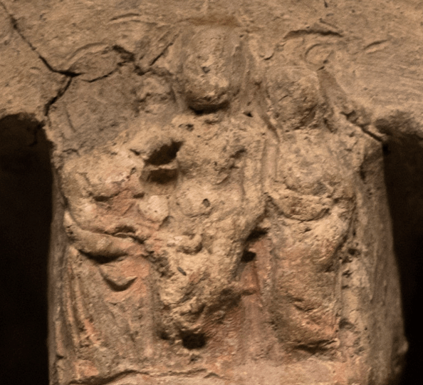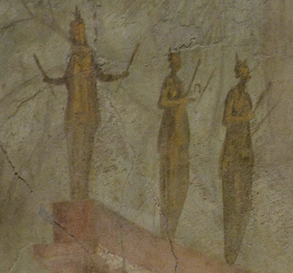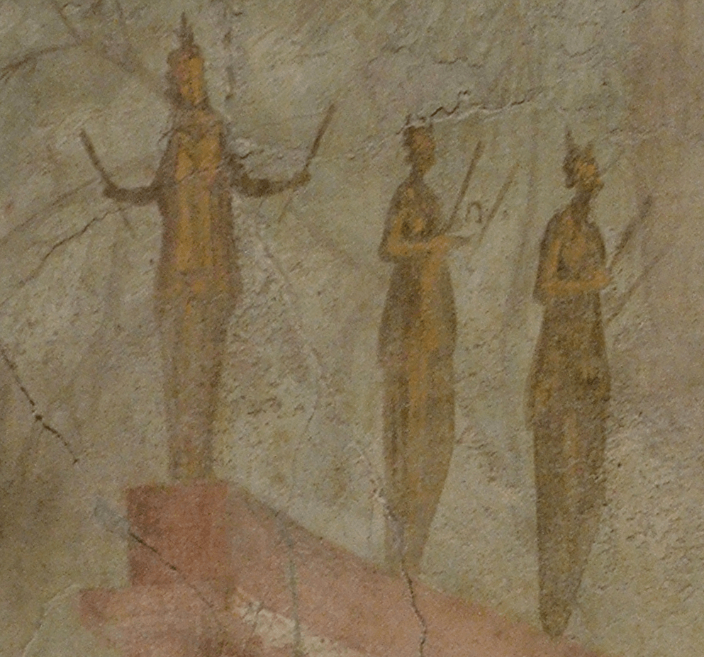 Notice the front most statue has something pointy almost like a lotus flower coming from her head while the other two seem to have crescent moons. The acroteria on the column and on the bridge in the background are clearly meant to evoke truly archaic terracotta architectural elements in a similar style.