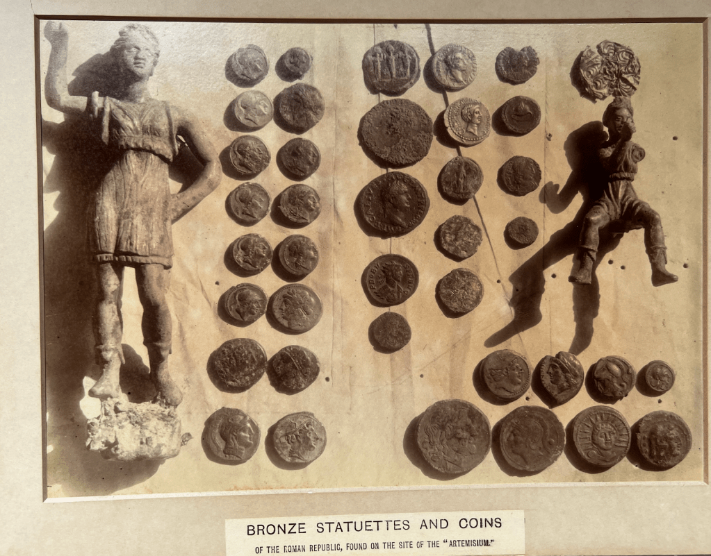 Also those apices/spikes coming out of their heads! Is this just for the purposes of the triangular composition? An artistic variation or something specific to the cult at this site? Could it be a stylized version of those trees popping out of the heads on the coins?
