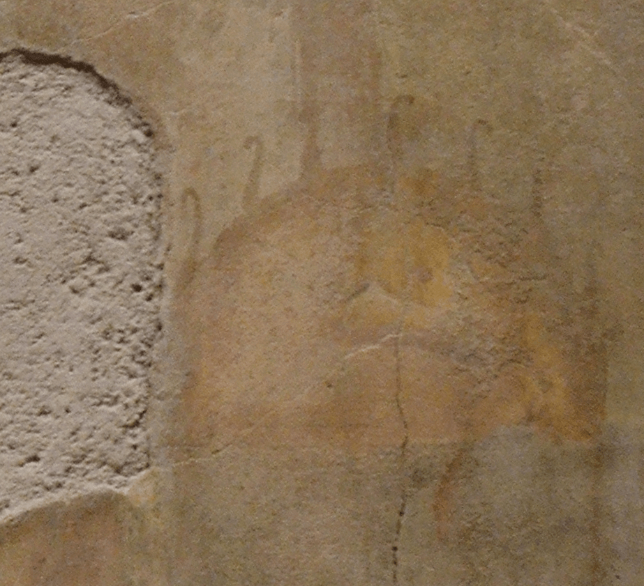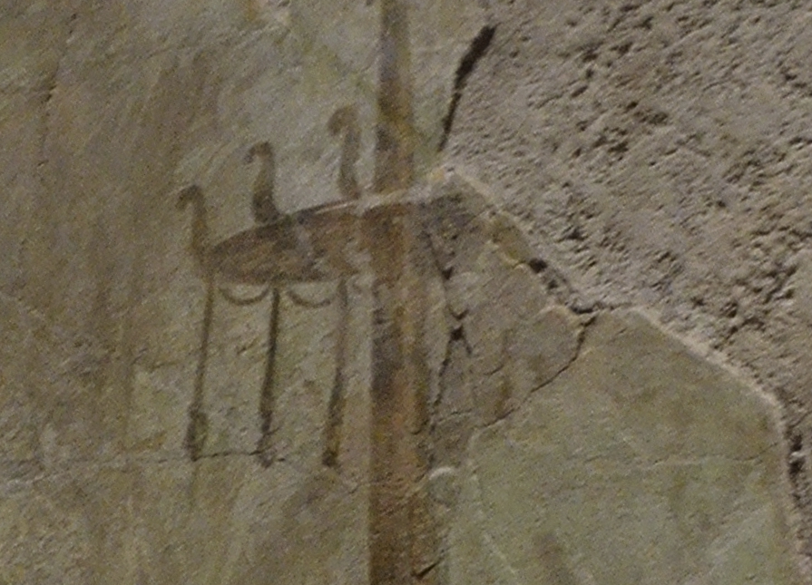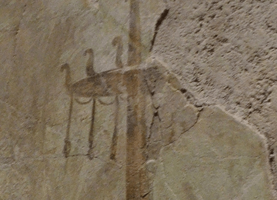 There is a strong horizontal line that seems to be behind the necks of the three figures. On some specimens it appears to rest on their shoulders an they hold it up with their hands. Some have interpreted this as a wall from behind which the plants or trees appear. Between the three women emerge two larger tree-like elements from the horizontal line directly above where their hands meet.