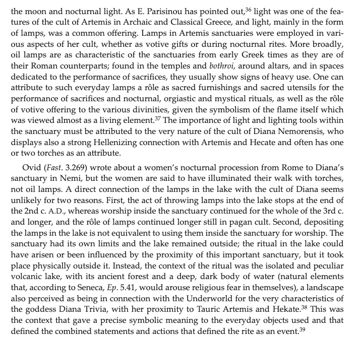 - Moltesen, Mette. “Diana and her followers in a late republican temple pediment from Nemi: a preliminary note.” In From Artemis to Diana: the goddess of man and beast, edited by Tobias Fischer-Hansen and Birte Poulsen. Acta Hyperborea; 12, 345-367. Copenhagen: Museum Tusculanum Pr., 2009. [ILL requested. V eager to read.]