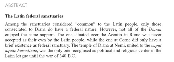 - Martínez-Pinna Nieto, Jorge. “Los santuarios federales latinos.” Revue Belge de Philologie et d’Histoire = Belgisch Tijdschrift voor Filologie en Geschiedenis 92, no. 1 (2014): 41-56. Doi: 10.3406/rbph.2014.8539 [open access]