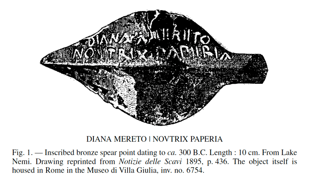 Inscription (AE 1896, 13 = CIL I², 45) on a bronze spearhead (Rome, Villa Giulia Museum, inv. 6754) discovered in the late 19th century at the Sanctuary of Diana at Lake Nemi, within an archaeological context containing anatomical votive objects—including breasts. Dating to approximately 300 BC, the dedication “Diana mereto / noutrix Paperia” was likely offered not by a slave, but by a freedwoman of the gens Papiria, where she served as a wet nurse. The absence of a cognomen aligns with the onomastic practices of the period. This role conferred significant social standing upon the woman who held it, empowering her to address the deity in her own name. The choice of a spearhead clearly demonstrates that this was by no means a petition pro lacte (for milk)—despite the votive objects discovered nearby—and that Diana is here regarded as the patroness of freedpersons and of those who assert agency over their own lives, rather than as the protectress of womanhood.