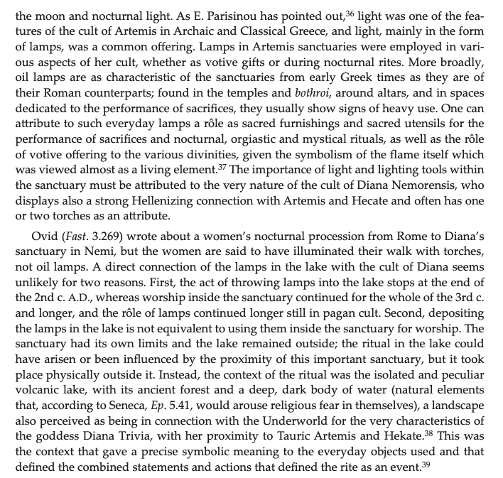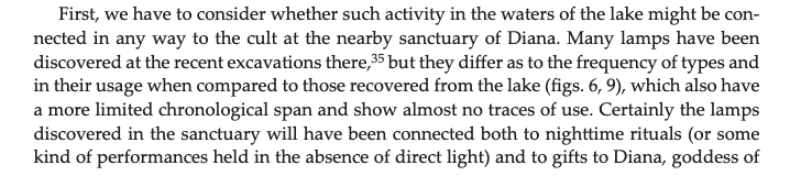 - Diosono, Francesca and Cinaglia, Tiziano. “Light on the water: ritual deposit of lamps in Lake Nemi.” Journal of Roman Archaeology 29, no. 1 (2016): 451-468. Doi: 10.1017/S104775940007224X