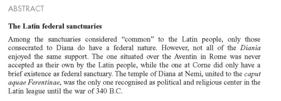 - Martínez-Pinna Nieto, Jorge. “Los santuarios federales latinos.” Revue Belge de Philologie et d’Histoire = Belgisch Tijdschrift voor Filologie en Geschiedenis 92, no. 1 (2014): 41-56. Doi: 10.3406/rbph.2014.8539 [open access]