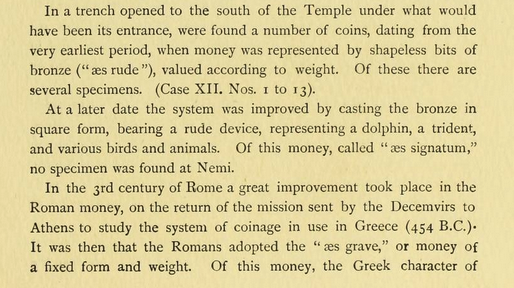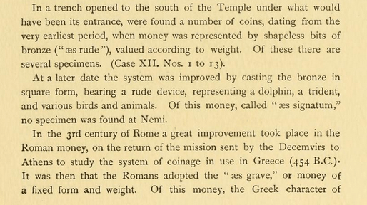 Here follows a discussion of the cast and struck coinage but with no indication that it was found in the same location as the aes rude.