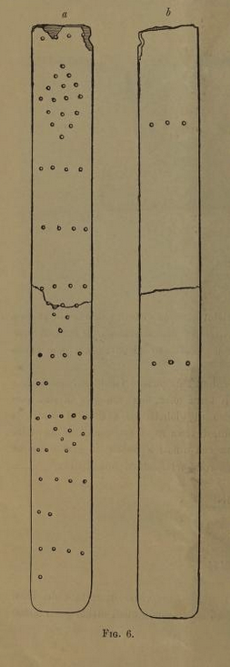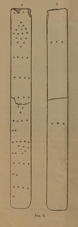 “But the most remarkable object brought to light by these excavations is a nearly rectangular bone strip, which served as a measuring rule for a Roman foot. Slightly more than half of it has survived, and—as can be seen here—it bears incisions on both sides (Fig. 6a–d). It measures 170 millimeters in length and 18 millimeters in width, and is divided into 20 sections formed by four groups of five. At the third line—starting from the intact end—a small triangle has been added, with its vertex pointing downward. Similarly, a like triangle has been added at the fifth line. At the eighth line, two triangles formed of dots have been added; they share the dividing line as a common base, but their vertices point in opposite directions—an arrangement that serves as an indicator. At the 148-millimeter mark—which constitutes exactly half of the 296 millimeters corresponding to the Roman foot—the significance of the divisional lines (each representing a *digitus*, or finger-breadth) becomes clear. There is also a notch. On the reverse side of this same measuring instrument (Fig. 6e), two small lines—each consisting of three dots—can be seen positioned at the 0.07-meter mark. This indicates that the reverse side of our instrument also served to measure the Roman foot, albeit divided into only four sections. Two bone strips found at Pompeii are quite similar to this one, as they, too, represent the Roman half-foot. However, those examples are fitted with small bronze plates at their ends and feature hinges designed to allow the other half of the measuring rule to fold back upon itself—much like a modern folding ruler.”
