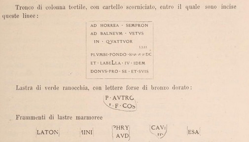 “At the precise location where the road to Vallericcia diverges from the Appian Way—situated 10 meters from the circular ruin known as Il Torrione (of the Chigi)—the remains of a noble and opulent monument were discovered. According to the opinion of the aforementioned Professor Lanciani—who was dispatched to the excavation site by the Ministry—this structure does not appear to be sepulchral in nature, particularly given that the site of the discovery seems to correspond to the interior of the ancient complex of Ariccia. Eleven marble blocks were recovered; some attain a considerable length of 2.70 meters. They belong primarily to the entablature, which is adorned with an exquisitely elegant frieze, as well as a cornice and architrave featuring intricate carving across all their constituent elements. One block retains the channels characteristic of rusticated masonry; two others belong to a large monumental inscription. This inscription—which I reproduce here based on the transcript provided by Cavaliere Lanciani—measured 1.52 meters in height and (presumably) 3.00 meters in length, and was framed by a gola molding and a listello fillet. The letters in the first line stand 0.17 meters high, while the remaining letters measure 0.14 meters.
