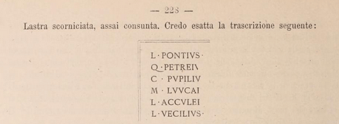 Excavations in the Area of the Temple of Diana. Report by Mr. Luigi BORSARI. Continuing throughout the month of April and into the first days of May, excavations in the center of the second terrace of the Temple of Diana Nemorense (cf. *Notizie* 1887, p. 120) yielded further artifacts constituting the sacred votive deposit—items similar to those described in previous reports. Once again, bronze coins were recovered—mostly Latium *asses* and coins of Campanian mintage—along with small bronze figurines depicting Diana the Huntress; various animal figures; buttons and rings; spearheads; tridents; and fibulae. A small silver *simpulum* (ladle) merits particular attention; measuring 0.08 meters in length, it features a curved handle terminating in the form of a swan’s neck and head. Inscribed upon the handle, using a technique of dense, minute dotting, is the legend: OV – SCARBENIO – CL. Subsequently, several rectangular tufa bases intended to support statuettes—likely of Diana—were recovered; the lead-set dowels used to secure the statuettes in place remain visible on the upper surfaces of the bases. The largest of these bases measures 0.47 x 0.27 x 0.25 meters and bears the following inscription: | AVRILIVS:C-F PORZIO R ITERVMESSDIDII \EISDEM: CONS©L | PROBAVIT The indication of paternity demonstrates beyond doubt that this individual was C. Aurelius C. f. C. n. Cotta, who—together with P. Sulpicius Ser. f. P. n. Galba Maximus II—held the consular office in the year 554 *ab urbe condita* (cf. *CIL* I, p. 496, 526), having attained the praetorship two years prior (Liv. xxx, 26). The smaller piece measures 0.29 m by 0.16 m and is fragmentary; consequently, of the inscription engraved upon it, only the following remains: 2 LEACIIVS=L: QCALLVS Ti o £ Furthermore, the following two fragments were recovered. One—on a chip of tufa measuring 0.13 m by 0.09 m—bears the letters: Li