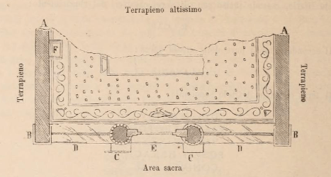 Additional investigations were conducted on the eastern side of the temple, adjacent to the *cella* that had been brought to light—partly in 1885 and partly in 1887—the ground plan of which was published on page 196 of the *Notizie* for the latter year. According to reports submitted by Mr. Borsari, three other *cellae* belonging to the temple were identified; however, these had been stripped of their contents and were, in terms of architectural decoration, considerably less elaborate than the *cella* mentioned above.