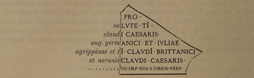 Subsequently, a highly significant epigraphic fragment was discovered, the text of which is derived from a paper squeeze. It is incised upon a slab of white marble—0.12 meters high and 0.22 meters wide—and almost certainly served to adorn the pediment of a small votive shrine dedicated to the Goddess for the well-being of the family of Emperor Claudius. It reads as follows: