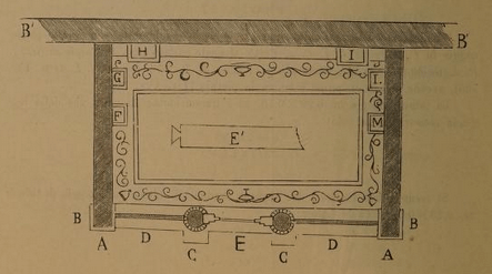A A Partition walls in *opus reticulatum*, with brick end-piers B B, which occupy the site of two columns. C C Brick columns 1.00 m in diameter, featuring a facing of fluted stucco painted red. The capitals—of the Tuscan-Doric style and finely carved in *peperino* stone—were discovered in front of the *cella*. The columns lack bases; they rest upon large travertine blocks sheathed in marble. D D *Peperino* thresholds, one meter thick and two meters long. They feature a “blind” groove—or longitudinal channel—into which a marble parapet was set. E Entrance doorway to the *cella*, constructed as follows: