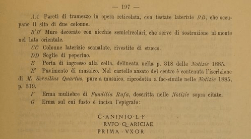 The most significant objects recovered during this initial phase of excavations were: the herm of Fundilia Rufa, surmounted by a portrait bust (Notizie 1885, p. 319; Bull. Inst., p. 227); and the shafts—lacking their busts—of the herms of Q. Zostius Q. f. Capito, rhetor (Notizie, loc. cit., p. 320; Bull. Inst., p. 236); of Z. Aenius Faustus, quart(arum) par(asitus) Apol(linis); of Licinia Chrysario; and of Staia L. l. Quinta (Notizie, loc. cit., p. 479; Bull. Inst., loc. cit., p. 286).