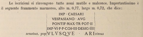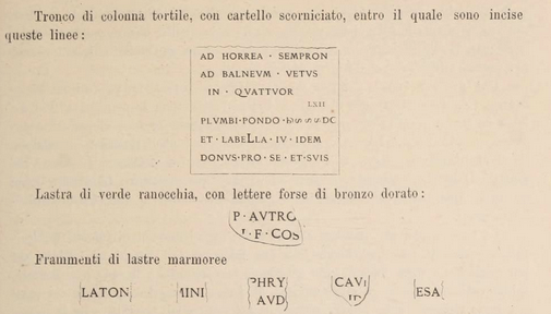 “At the precise location where the road to Vallericcia diverges from the Appian Way—situated 10 meters from the circular ruin known as Il Torrione (of the Chigi)—the remains of a noble and opulent monument were discovered. According to the opinion of the aforementioned Professor Lanciani—who was dispatched to the excavation site by the Ministry—this structure does not appear to be sepulchral in nature, particularly given that the site of the discovery seems to correspond to the interior of the ancient complex of Ariccia. Eleven marble blocks were recovered; some attain a considerable length of 2.70 meters. They belong primarily to the entablature, which is adorned with an exquisitely elegant frieze, as well as a cornice and architrave featuring intricate carving across all their constituent elements. One block retains the channels characteristic of rusticated masonry; two others belong to a large monumental inscription. This inscription—which I reproduce here based on the transcript provided by Cavaliere Lanciani—measured 1.52 meters in height and (presumably) 3.00 meters in length, and was framed by a gola molding and a listello fillet. The letters in the first line stand 0.17 meters high, while the remaining letters measure 0.14 meters.