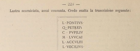 Excavations in the Area of the Temple of Diana. Report by Mr. Luigi BORSARI. Continuing throughout the month of April and into the first days of May, excavations in the center of the second terrace of the Temple of Diana Nemorense (cf. *Notizie* 1887, p. 120) yielded further artifacts constituting the sacred votive deposit—items similar to those described in previous reports. Once again, bronze coins were recovered—mostly Latium *asses* and coins of Campanian mintage—along with small bronze figurines depicting Diana the Huntress; various animal figures; buttons and rings; spearheads; tridents; and fibulae. A small silver *simpulum* (ladle) merits particular attention; measuring 0.08 meters in length, it features a curved handle terminating in the form of a swan’s neck and head. Inscribed upon the handle, using a technique of dense, minute dotting, is the legend: OV – SCARBENIO – CL. Subsequently, several rectangular tufa bases intended to support statuettes—likely of Diana—were recovered; the lead-set dowels used to secure the statuettes in place remain visible on the upper surfaces of the bases. The largest of these bases measures 0.47 x 0.27 x 0.25 meters and bears the following inscription: | AVRILIVS:C-F PORZIO R ITERVMESSDIDII \EISDEM: CONS©L | PROBAVIT The indication of paternity demonstrates beyond doubt that this individual was C. Aurelius C. f. C. n. Cotta, who—together with P. Sulpicius Ser. f. P. n. Galba Maximus II—held the consular office in the year 554 *ab urbe condita* (cf. *CIL* I, p. 496, 526), having attained the praetorship two years prior (Liv. xxx, 26). The smaller piece measures 0.29 m by 0.16 m and is fragmentary; consequently, of the inscription engraved upon it, only the following remains: 2 LEACIIVS=L: QCALLVS Ti o £ Furthermore, the following two fragments were recovered. One—on a chip of tufa measuring 0.13 m by 0.09 m—bears the letters: Li