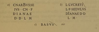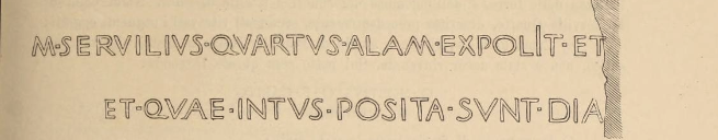 POVBLILIA-TVRPDILIA:CN-VXOR HOCE: SEIGNVM-PRO-CN-FILIOD DIANAI: DONVM- DEDIT . Following the letter R at the end of the first line, and beneath the letters IA of DIANAI at the beginning of the third line, one can discern the holes through which the nails passed to secure the plaque in place. Another small hole is situated beneath the final letter of TVRMILIA, positioned between the first and second lines. The second plaque—being thinner, and consequently less well-preserved (Plate III, Fig. 2)—nevertheless displays a legend that remains almost entirely intact, even though it was executed in fine, shallow strokes and inscribed by an unsteady hand. That nothing is missing can be established by the symmetrical arrangement of the words, as well as by the physical evidence: specifically, the presence of two holes—one on the right and one on the left—intended for the insertion of nails; these holes were, as a general rule, positioned at the points where the inscription concluded. If this interpretation is correct, only a single difficulty arises in the reading of this inscription—specifically within the first line, or rather, confined to the very last letter of that line—given that the initial letter C is perfectly legible. We would therefore have: