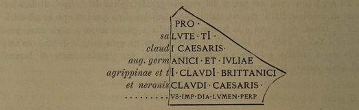 Subsequently, a highly significant epigraphic fragment was discovered, the text of which is derived from a paper squeeze. It is incised upon a slab of white marble—0.12 meters high and 0.22 meters wide—and almost certainly served to adorn the pediment of a small votive shrine dedicated to the Goddess for the well-being of the family of Emperor Claudius. It reads as follows: