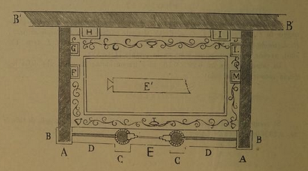 A A Partition walls in *opus reticulatum*, with brick end-piers B B, which occupy the site of two columns. C C Brick columns 1.00 m in diameter, featuring a facing of fluted stucco painted red. The capitals—of the Tuscan-Doric style and finely carved in *peperino* stone—were discovered in front of the *cella*. The columns lack bases; they rest upon large travertine blocks sheathed in marble. D D *Peperino* thresholds, one meter thick and two meters long. They feature a “blind” groove—or longitudinal channel—into which a marble parapet was set. E Entrance doorway to the *cella*, constructed as follows: