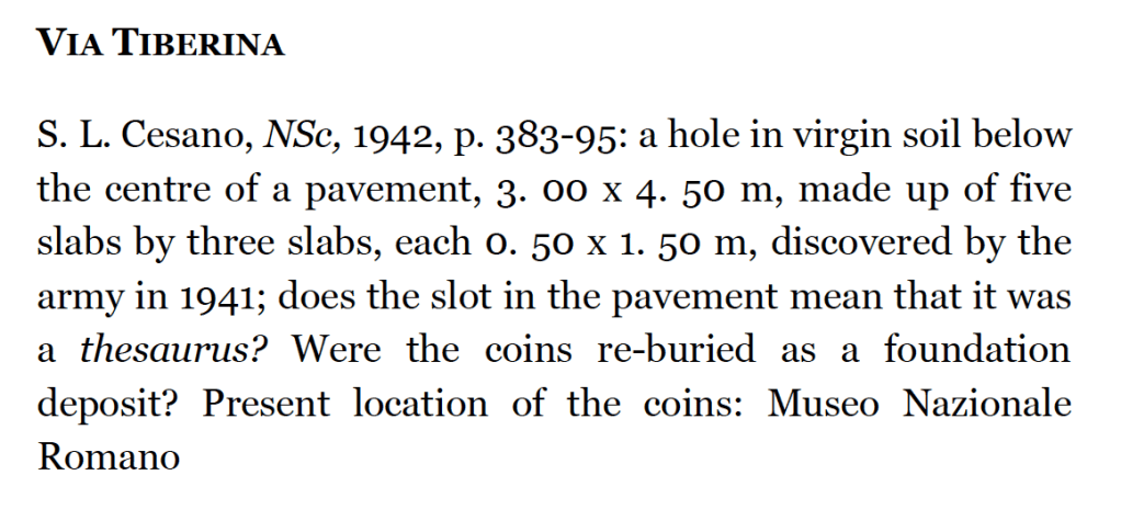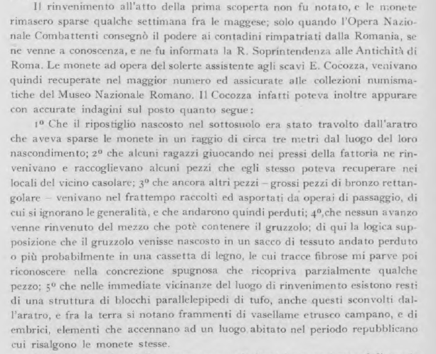 Notice here in Cesano 1942, her point no. 3: large rectangular pieces of bronze were removed by unknown passing workers and could not be retrieved by E. Cocozza. This strongly suggests that Roman Currency Bars (so-called aes signatum) were part of this deposit.