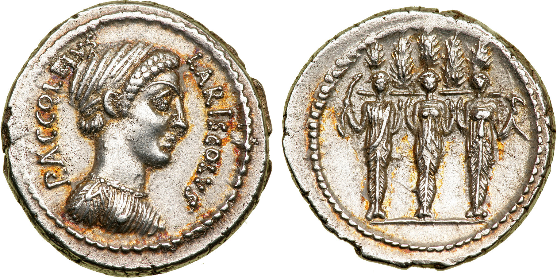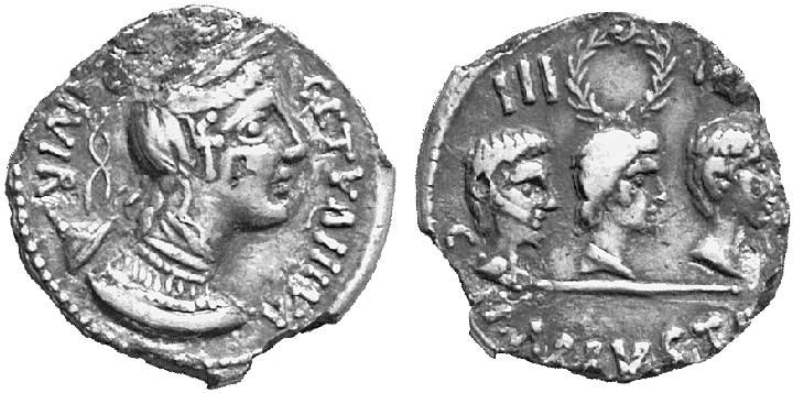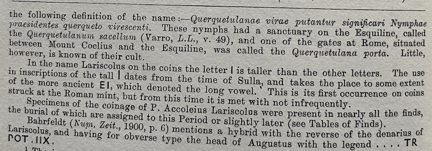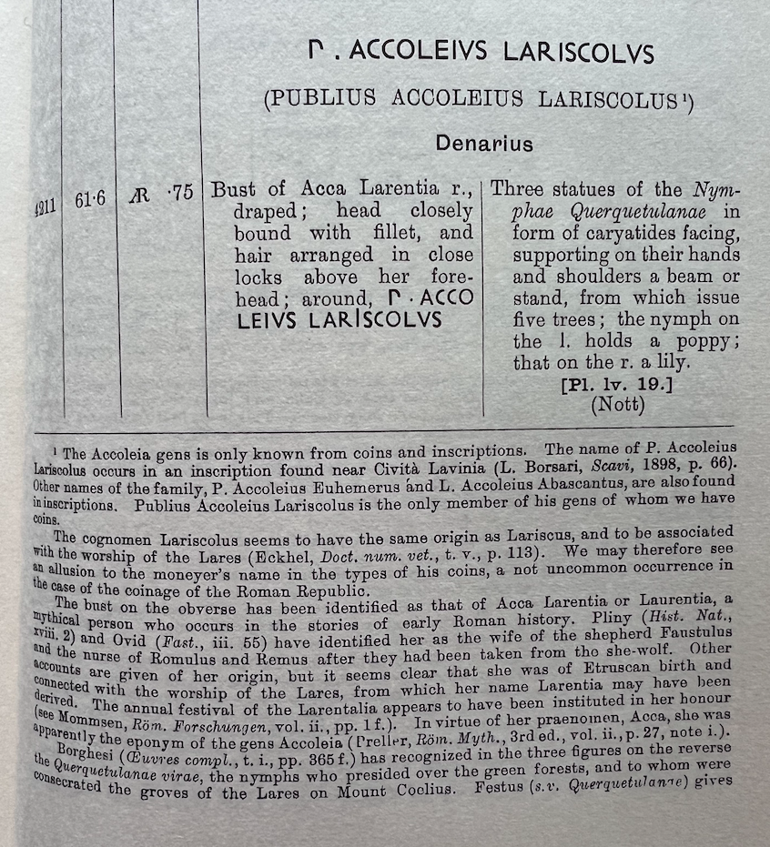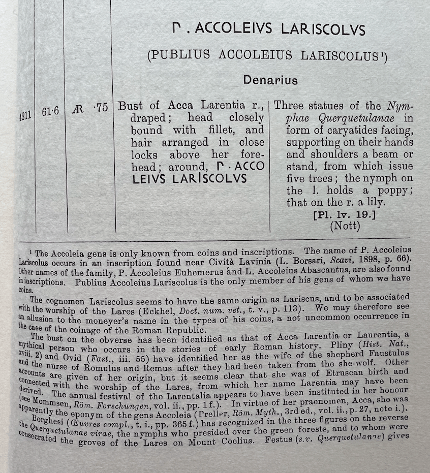 Smyth 1856: 2 describes two specimens of RRC 486/1. He discounts an unattributed description of as the Caryatidae, and favors seeing it as the metamorphosis of the three Clymenidae, sisters of Phaeton, with the obverse being their mother, Clymene. He quotes in Latin a line from Havercamp. The view is over a hundred years old by the time Smyth paraphrases. AGNETHLER 1746: 72-73 (next set of images) makes explicit what Smyth only implies. The attraction of this interpretation is based on the moneyer’s cognomen LARISCOLUS being derived from larix: the larch tree. The idea was that the three figures are turning into these trees. Smyth rejects an idea he attributes to Cavedoni that the obverse represents Acca Laurentia and that the money is thereby associating he gens, ACCOLEIUS, with the mother of the Lares and more over implying a connection between his cognomen and these protective deities.