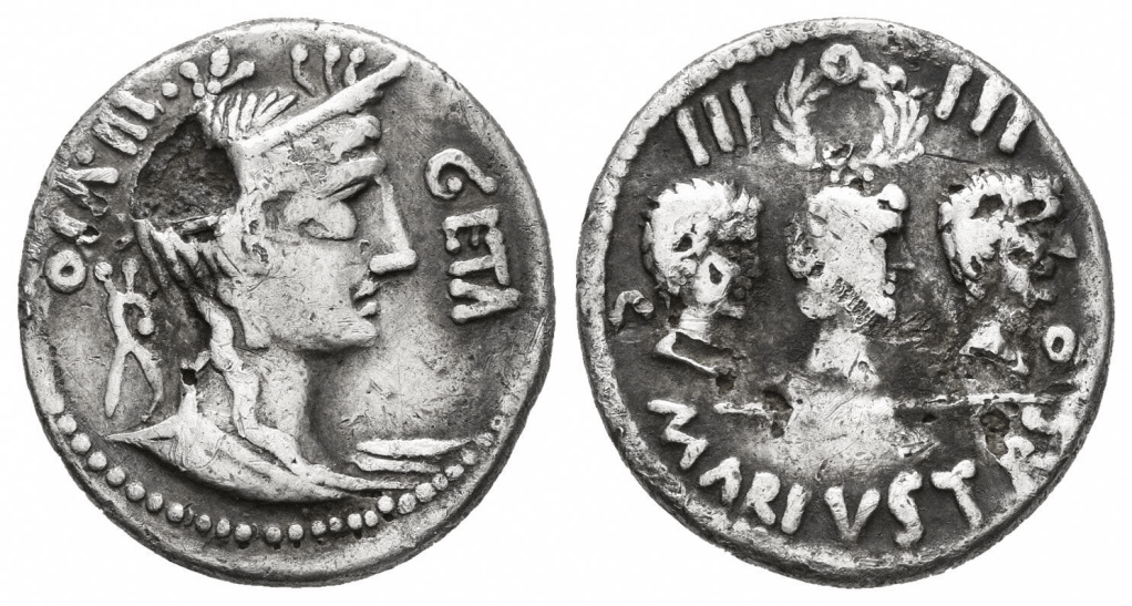 From Schaefer’s Archives (presumed forger’s die, now in Zurich money museum (see previous blog post)Röm. Republik: P. Accoleius Lariscolus Berlin 18202033 = 1882 Sandes = RRC Nr. 486,1 (datiert 43 v. Chr.); B. Woytek, Arma et Nummi. Forschungen zur römischen Finanzgeschichte und Münzprägung der Jahre 49 bis 42 v. Chr. (2003) 445-448. 558 (41 v. Chr.).